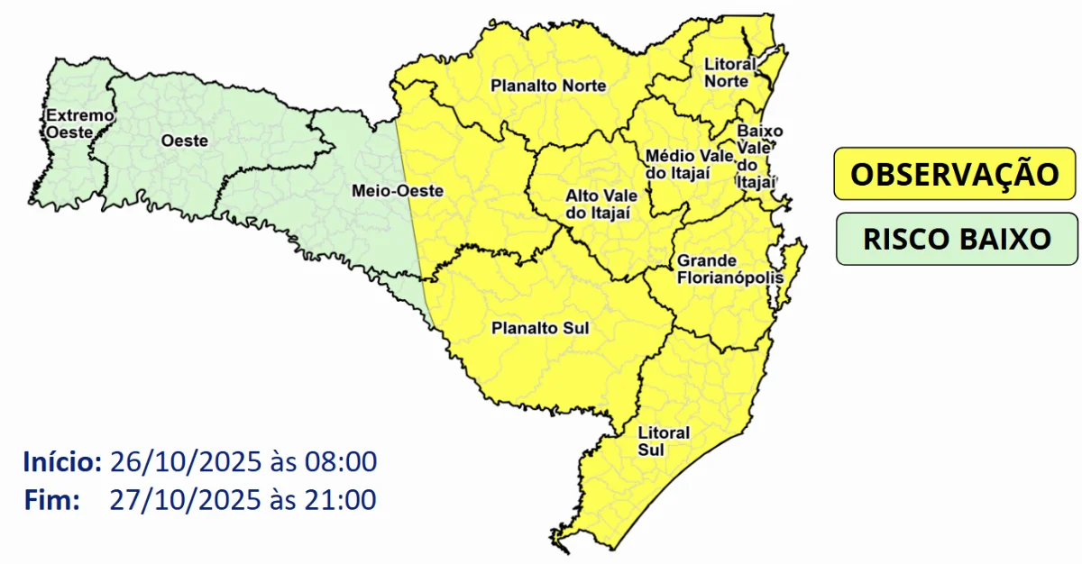 Neste domingo (26), o avanço de uma frente fria começa a mudar as condições do tempo em Santa Catarina. Entre domingo e segunda-feira (27), as chuvas ganham força sobretudo entre os planaltos, em todo o Vale do Itajaí e nas regiões litorâneas, onde o risco é moderado para alagamentos e enxurradas pontuais. Essas condições persistem ao longo da segunda-feira.